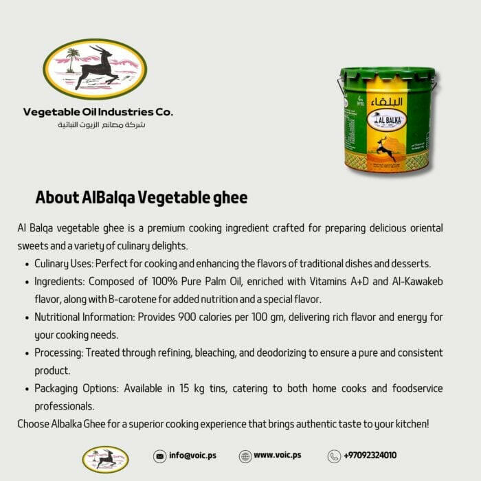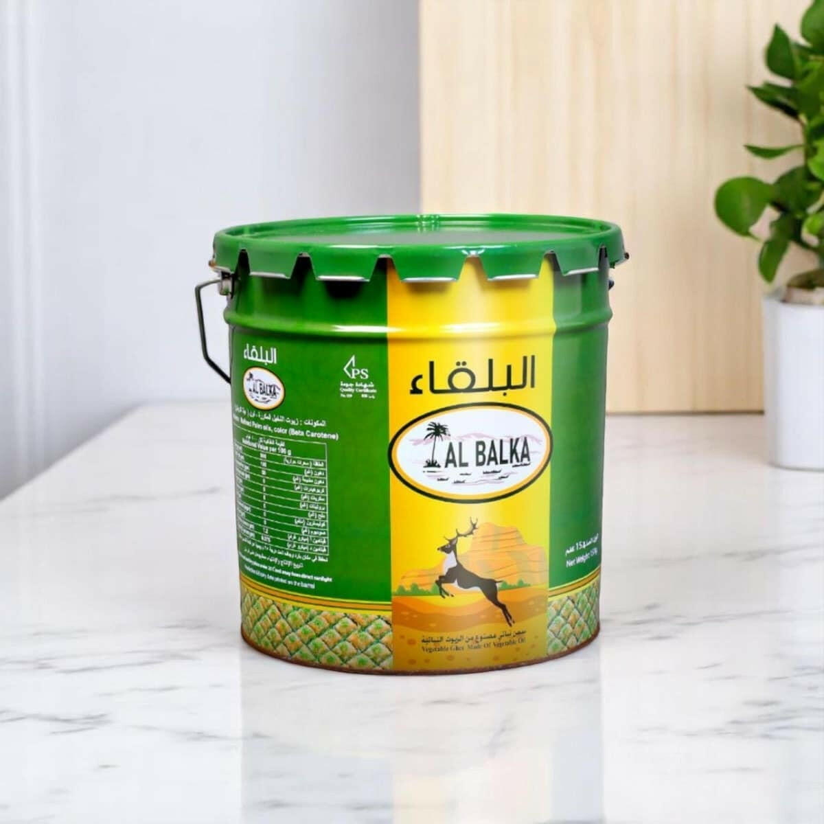 Al Balka Vegetable Ghee 15KG is a high-quality, 100% pure palm oil ghee crafted for authentic Palestinian and Middle Eastern cooking. Trusted by chefs and families, it's ideal for oriental sweets like baklava and basbousa, as well as traditional savory dishes.