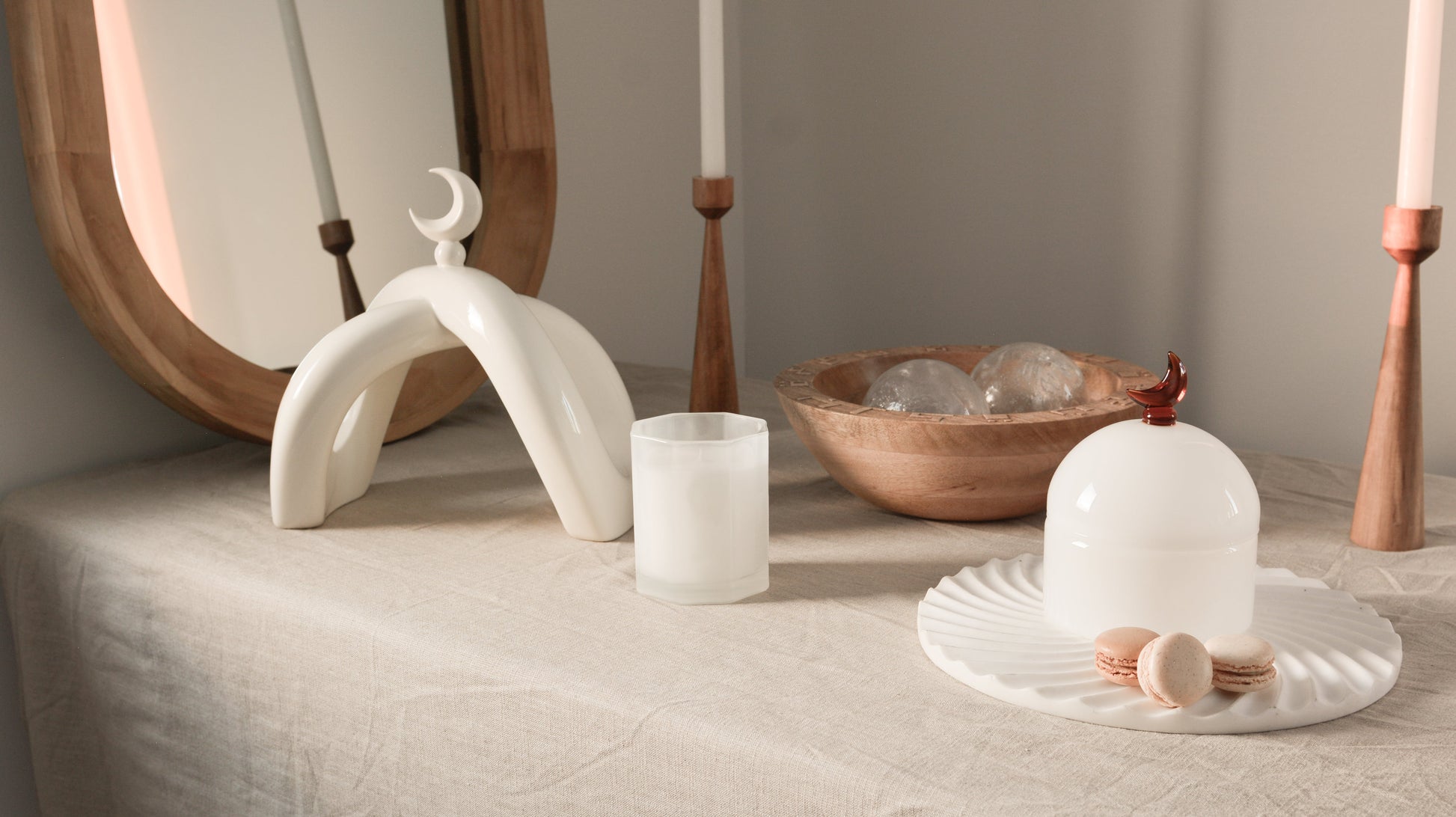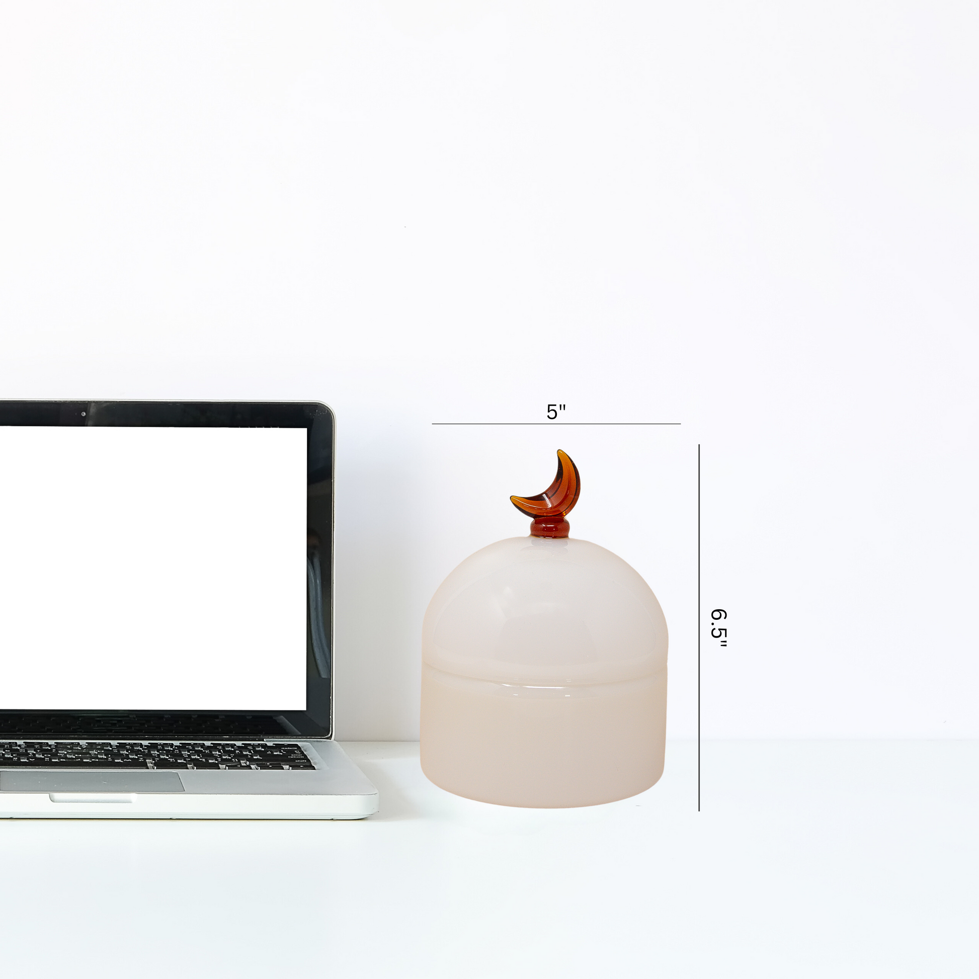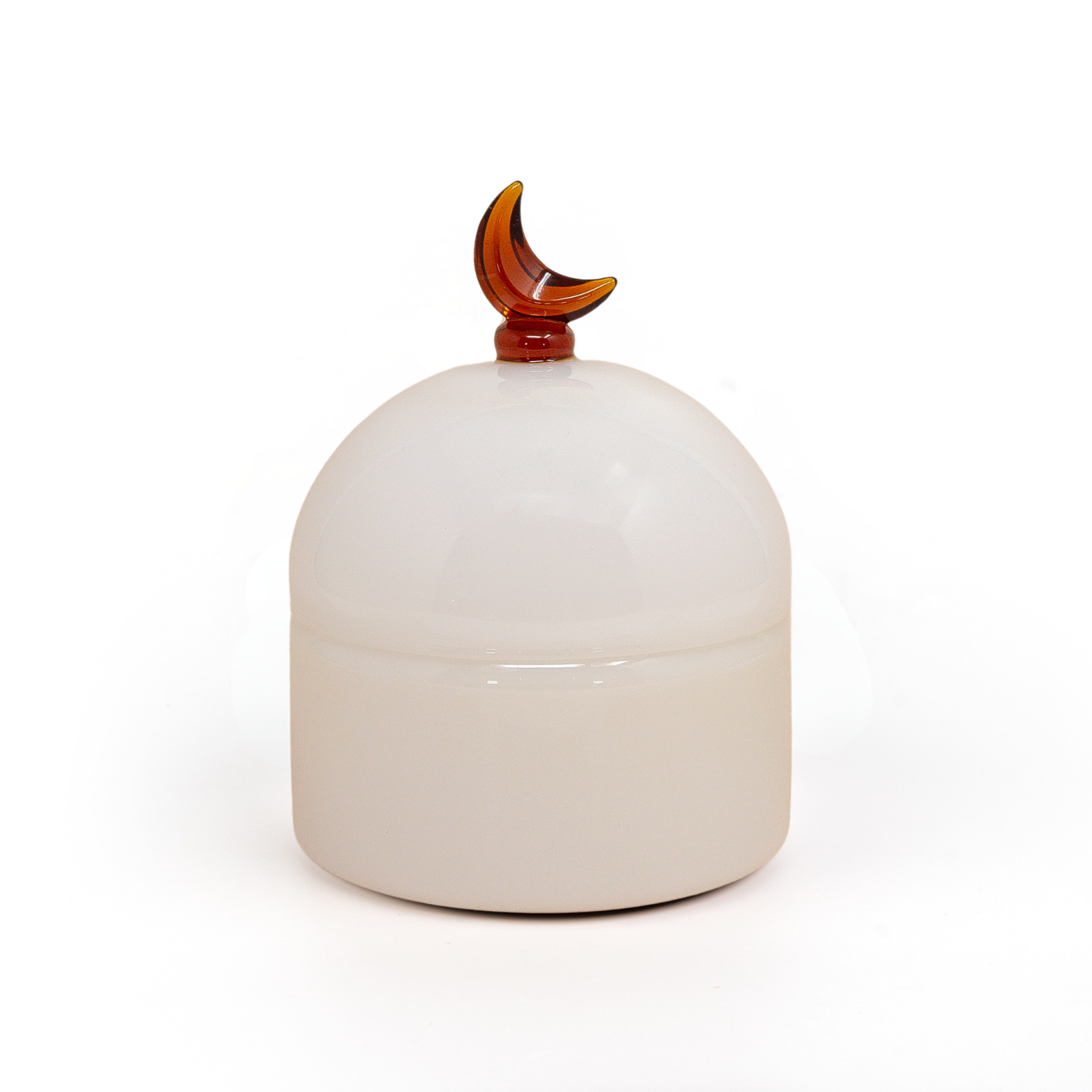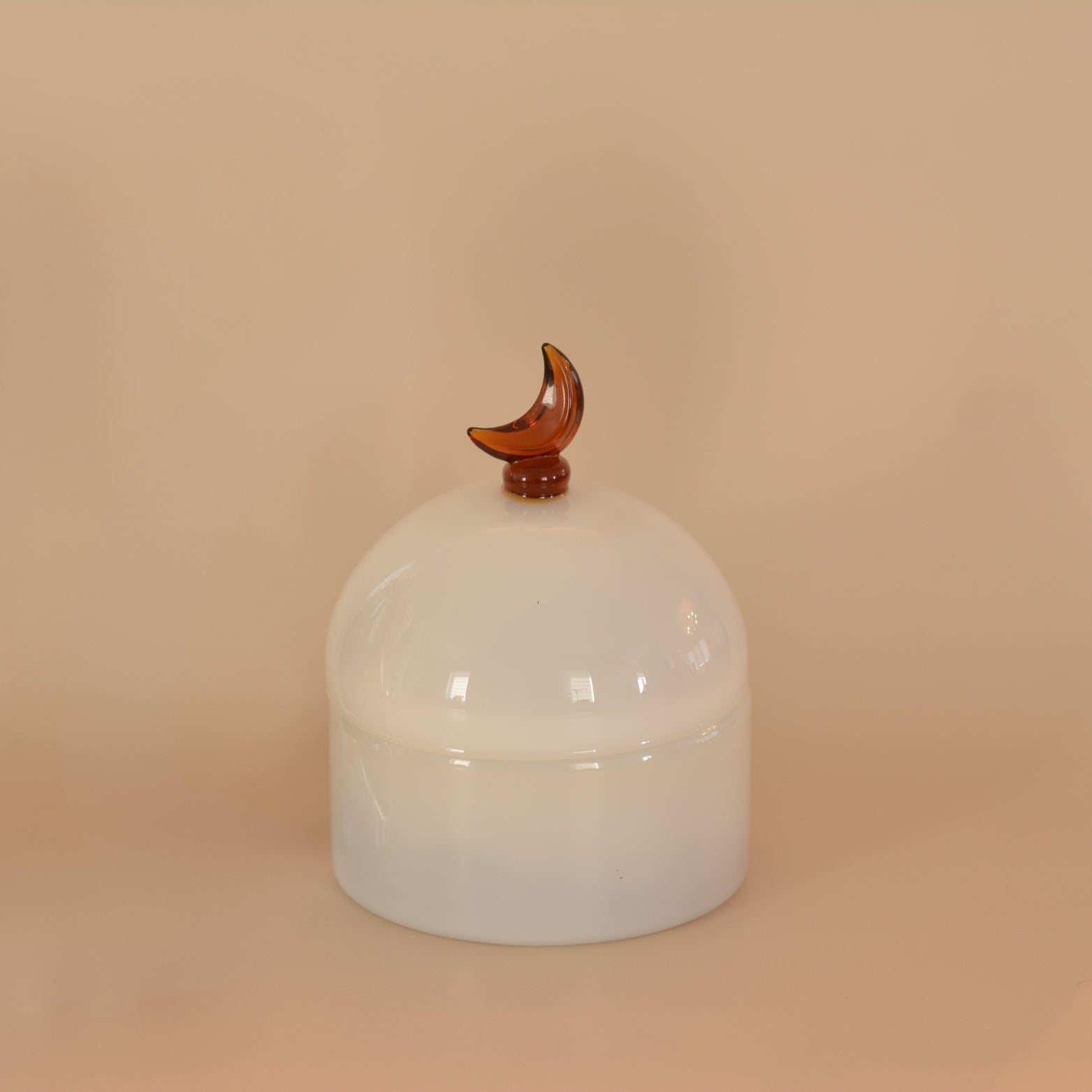 Crafted for the minimalist, the 'Full Moon' jar is a versatile decor choice for the Ramadan season, elegantly transitioning into Eid with its pristine white body and amber crescent touch. Perfect for those who appreciate a subtle celebration of these occasions, it is equally suited as a special gift or a tasteful centerpiece.