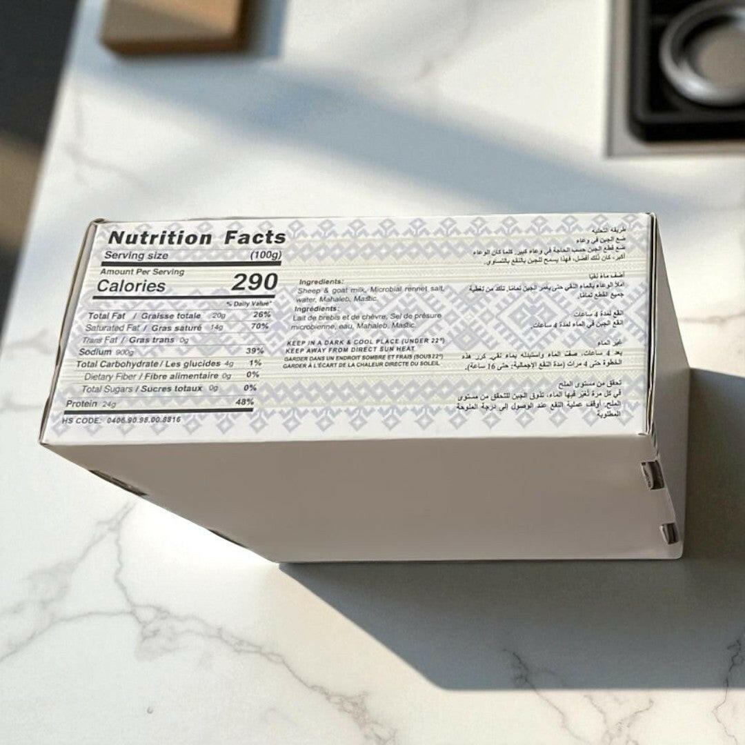 Authentic Palestinian Nabulsi cheese made from a premium blend of sheep and goat milk. Brined for rich, creamy flavor with a slightly salty tang.